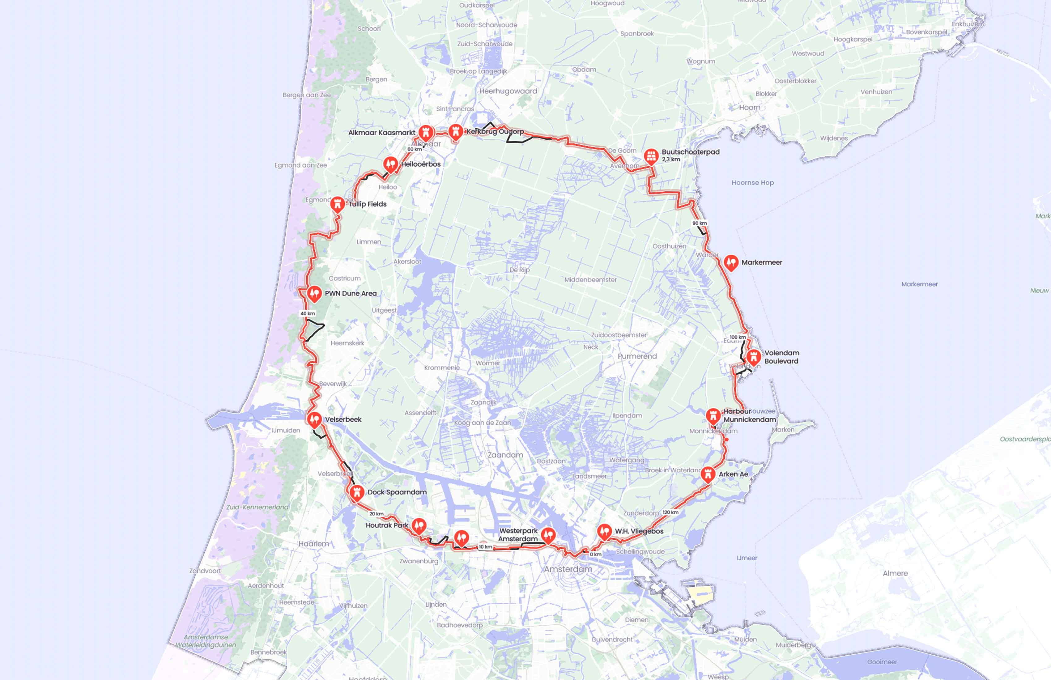 To put this rondo on the map, you make an impressive loop through North Holland. Along the way, you pass various historical highlights, including the world-famous canals of Amsterdam and the legendary Munnikenweg in Alkmaar.